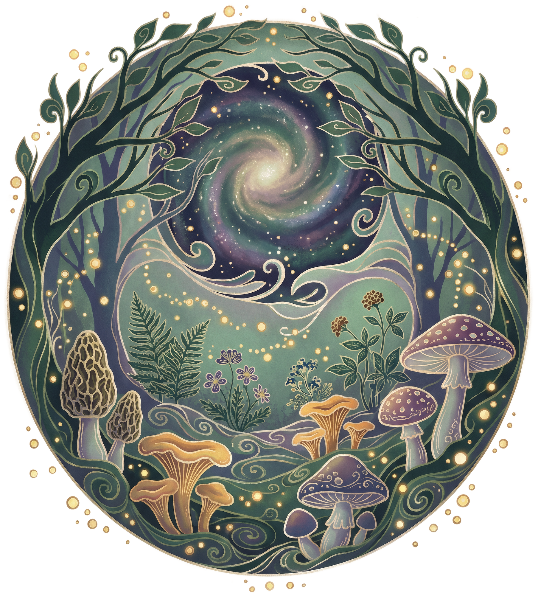 Starwoven Grove feels like stepping into a hidden clearing where the forest and the cosmos speak the same language. Firefly-light drifts through curling branches and soft ferns, pooling around mushrooms and wild blooms—while a spiral of starlight turns overhead like a lantern in the sky. A quiet reminder that wonder is woven into every detail of the natural world.