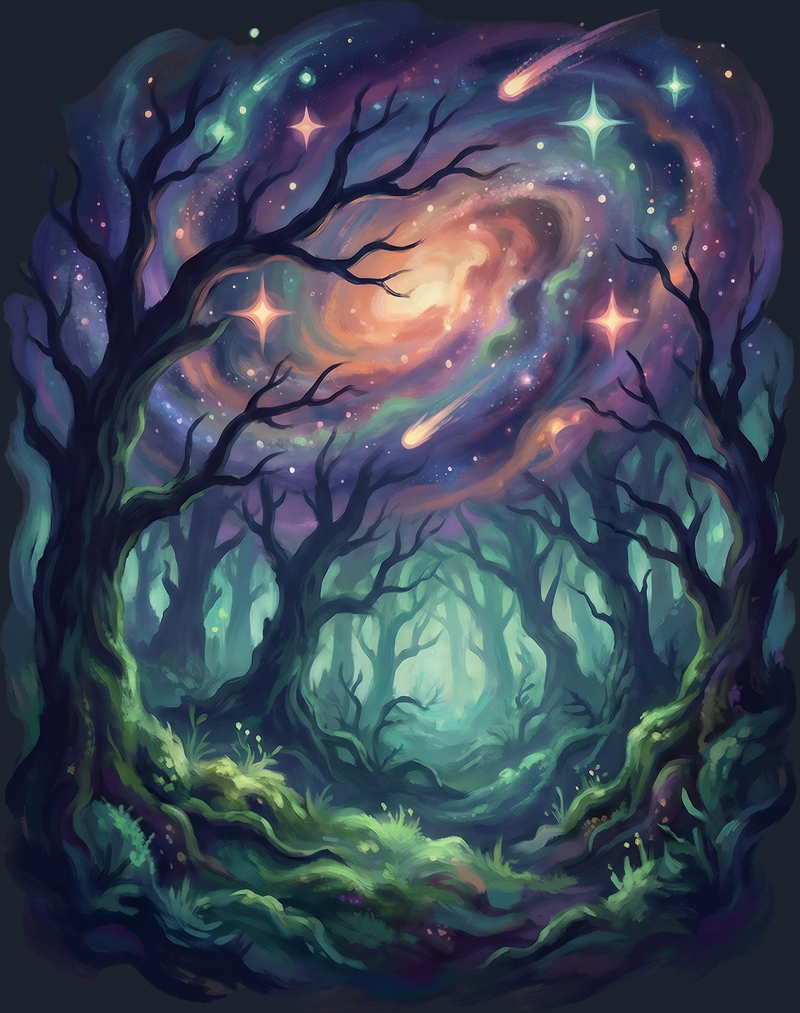 A moody woodland beneath a swirling sky—bare branches reaching up while starlight turns like a slow-moving tide overhead. For the nights you can feel the universe leaning close.