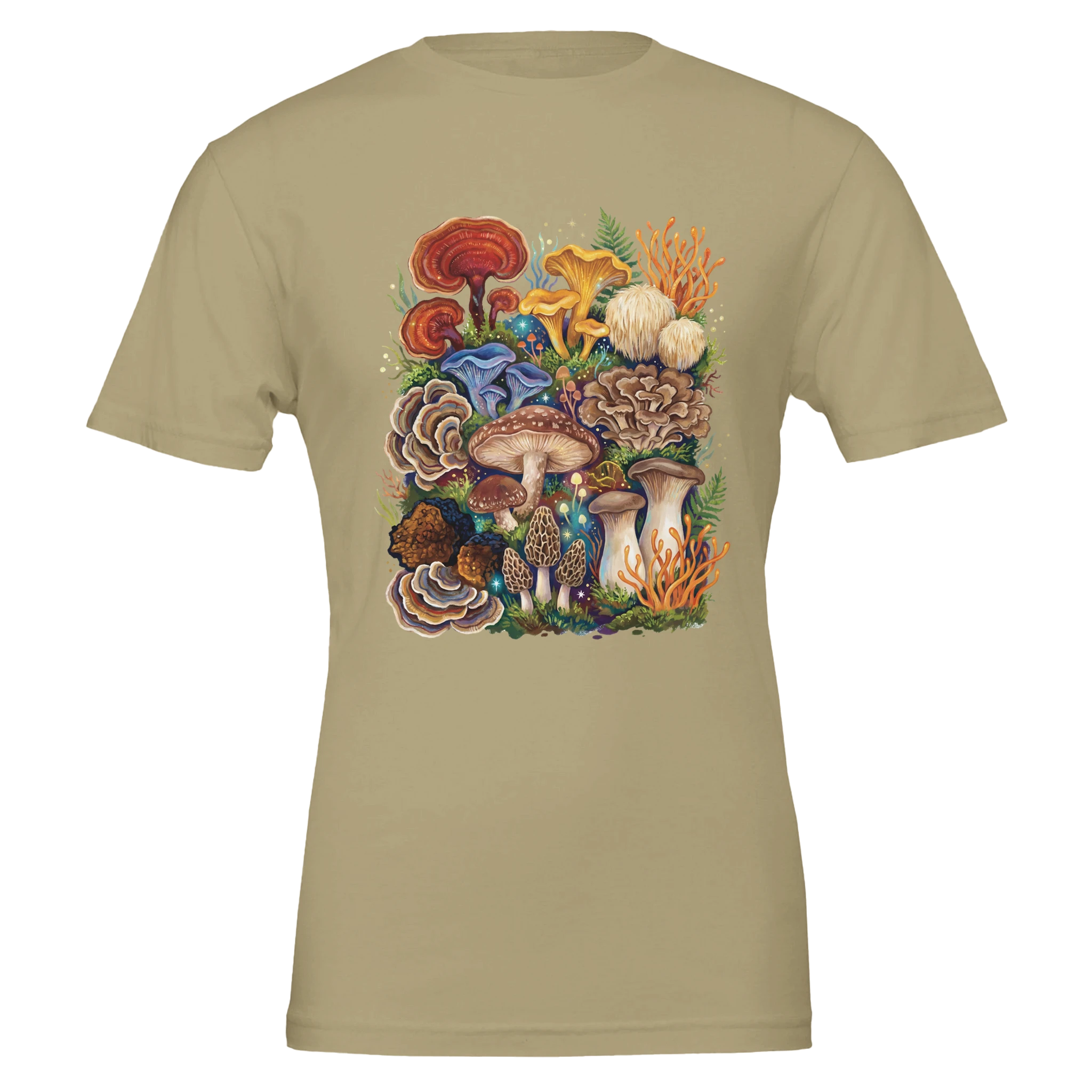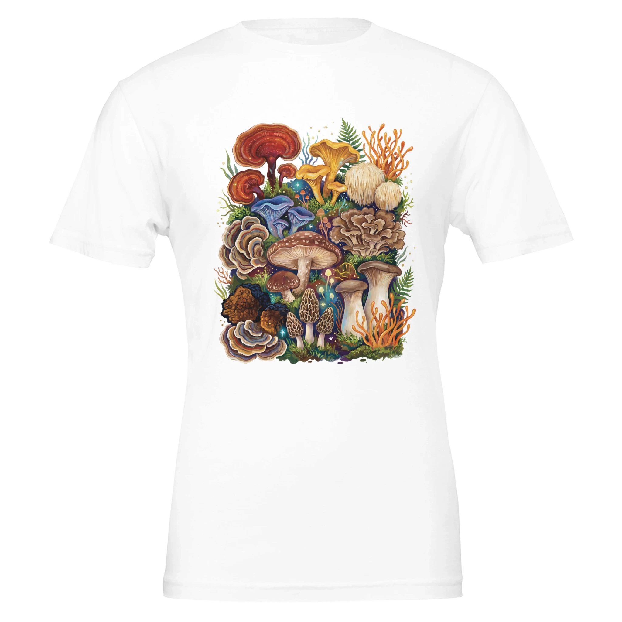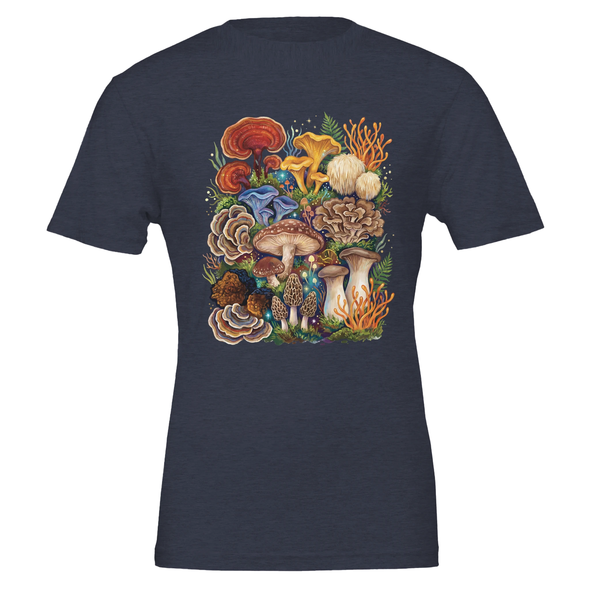 For the true fungi obsessed: this tee is a greatest-hits lineup of the mushroom world—cordyceps, chaga, king trumpet, chanterelles, morels, turkey tail, red reishi, lion’s mane, maitake, blue oyster, and shiitake—all gathered into one bold, storybook collage. A wearable celebration of texture, form, and that unmistakable thrill of spotting something incredible on the forest floor.