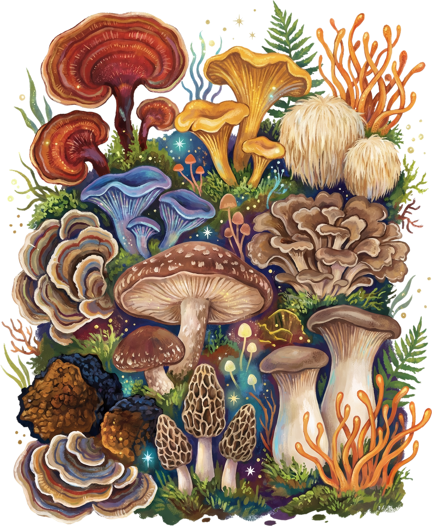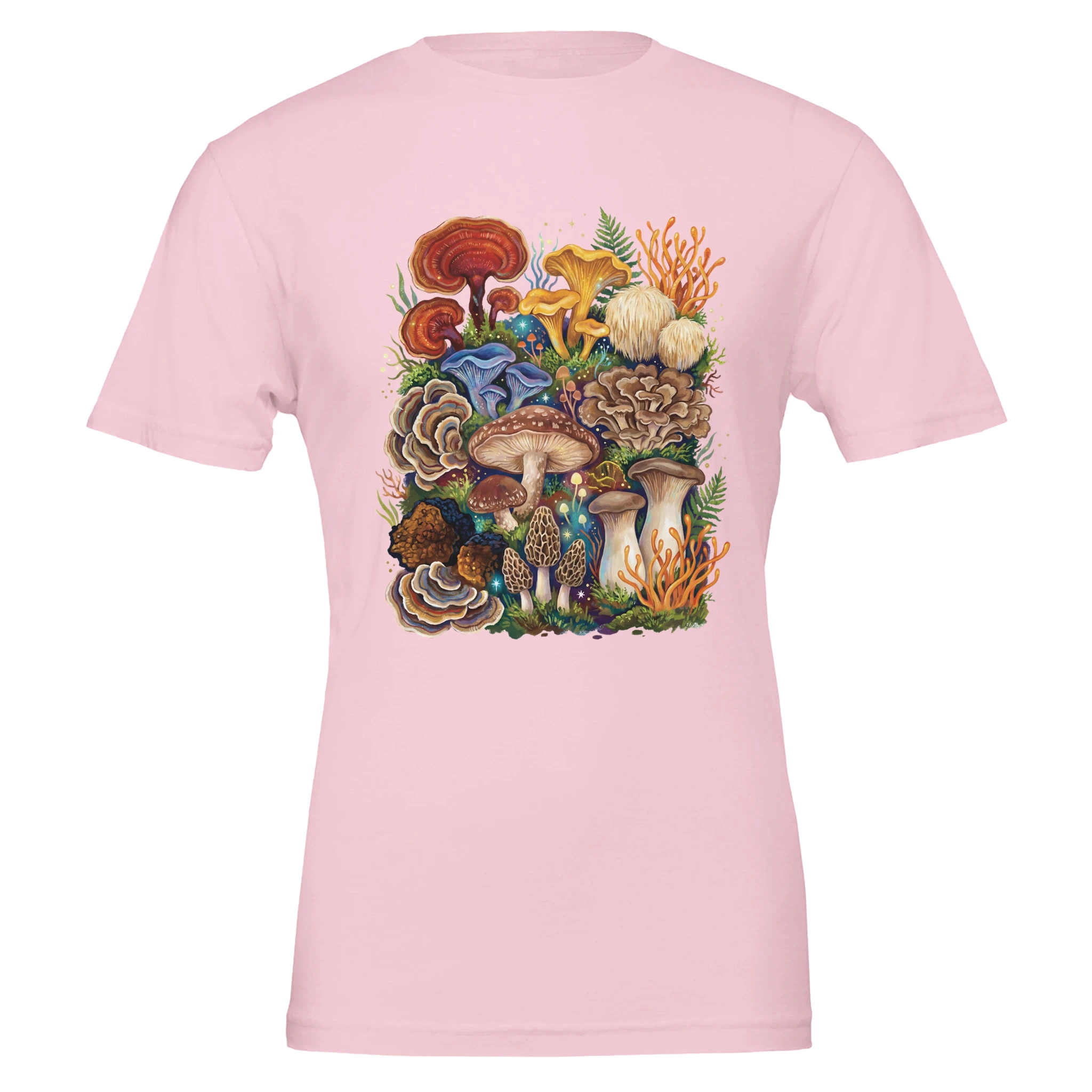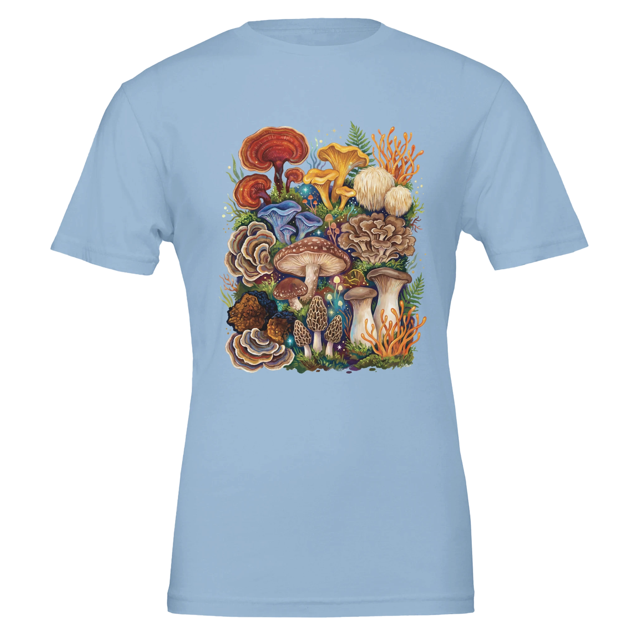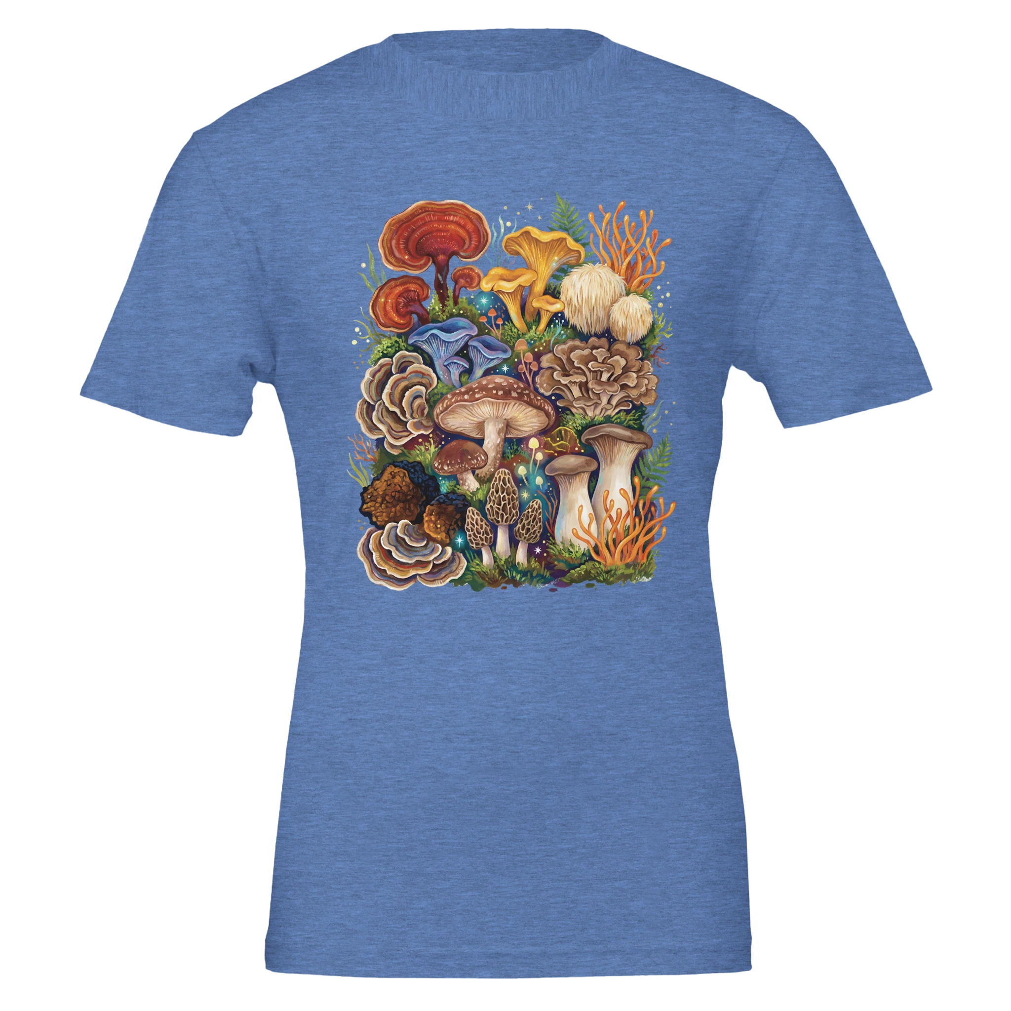 For the true fungi obsessed: this tee is a greatest-hits lineup of the mushroom world—cordyceps, chaga, king trumpet, chanterelles, morels, turkey tail, red reishi, lion’s mane, maitake, blue oyster, and shiitake—all gathered into one bold, storybook collage. A wearable celebration of texture, form, and that unmistakable thrill of spotting something incredible on the forest floor.