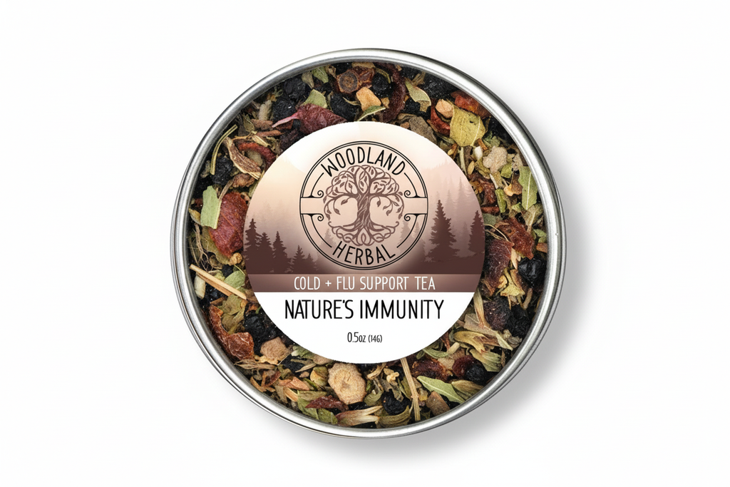 Nature's Immunity Tea is an old family recipe for building up the immune system, which also aids cold symptom recovery, viral response, and respiratory function. In our family, when someone starts feeling a little under the weather, or when the sniffles start, we make them a cup of this tea. When a flu or virus is apparent, then we drink 2-3 cups a day and take a tablespoon of our elderberry syrup blend which is available in autumn. Nature's Immunity brings powerhouse immunity herbs of Elderberry, Elderflower, Echinacea, and Rosehips together with stimulating Peppermint, warming Ginger root, calming and viral support herb Lemon Balm, and finish with our most beloved respiratory herbs in Mullein and Licorice Root.‡