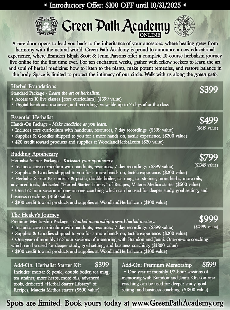A rare door opens to lead you back to the inheritance of your ancestors, where healing grew from harmony with the natural world. Green Path Academy is proud to announce a new educational experience, where Brandon Elijah Scott & Jenni Parsons offer a complete 10-course herbalism journey live online for the first time ever. For ten enchanted weeks, gather with fellow seekers to learn the art and soul of herbal medicine: how to listen to the plants, make potent remedies, and restore balance in the body. Space is limited to protect the intimacy of our circle. Walk with us along the green path.