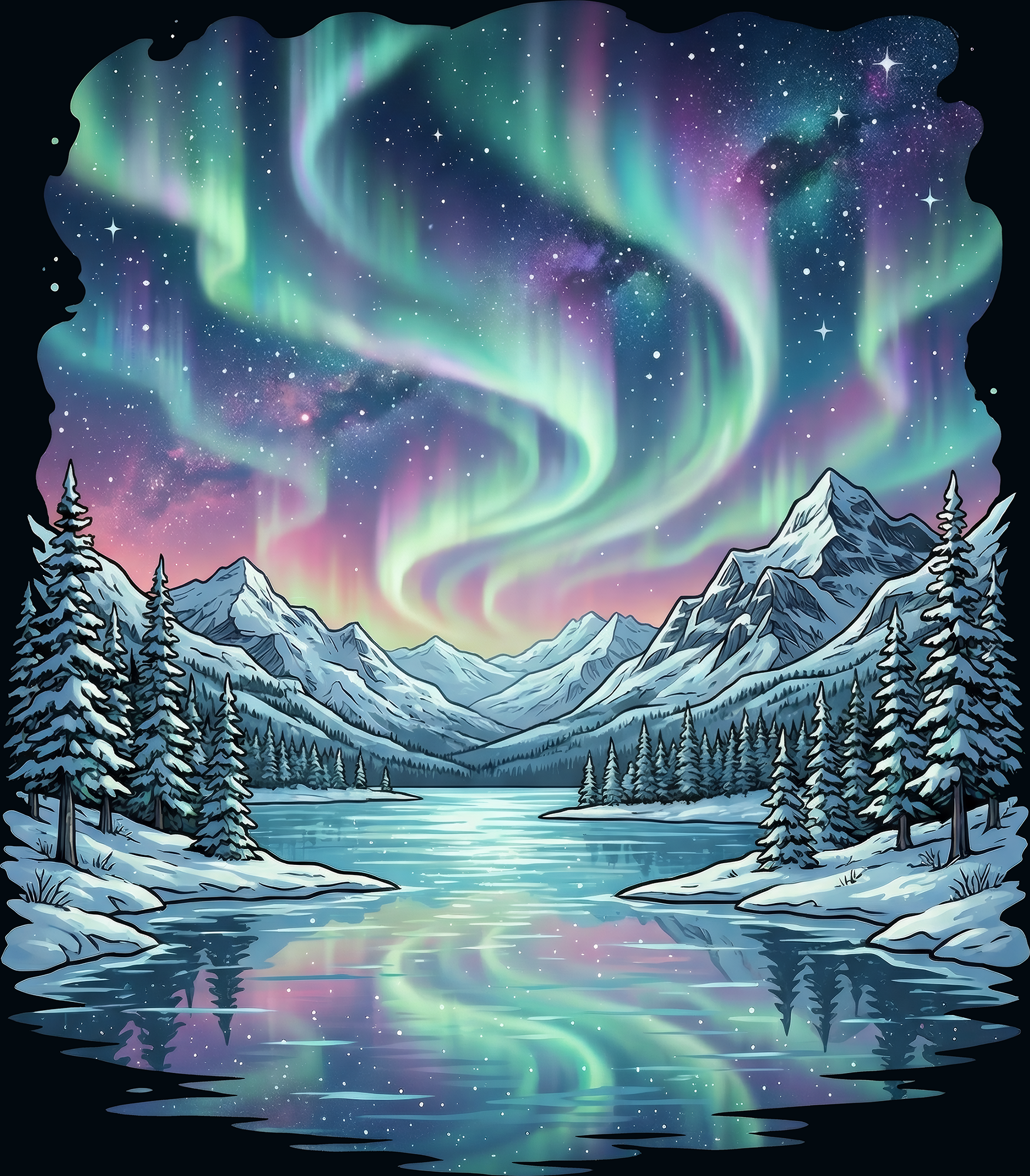 Snowy peaks stand watch over a glass-still lake while the northern lights spill overhead in slow, luminous ribbons. This design carries that crisp, hush-filled kind of peace—the breath-deep quiet you only find when the world turns silent and the sky starts to sing.