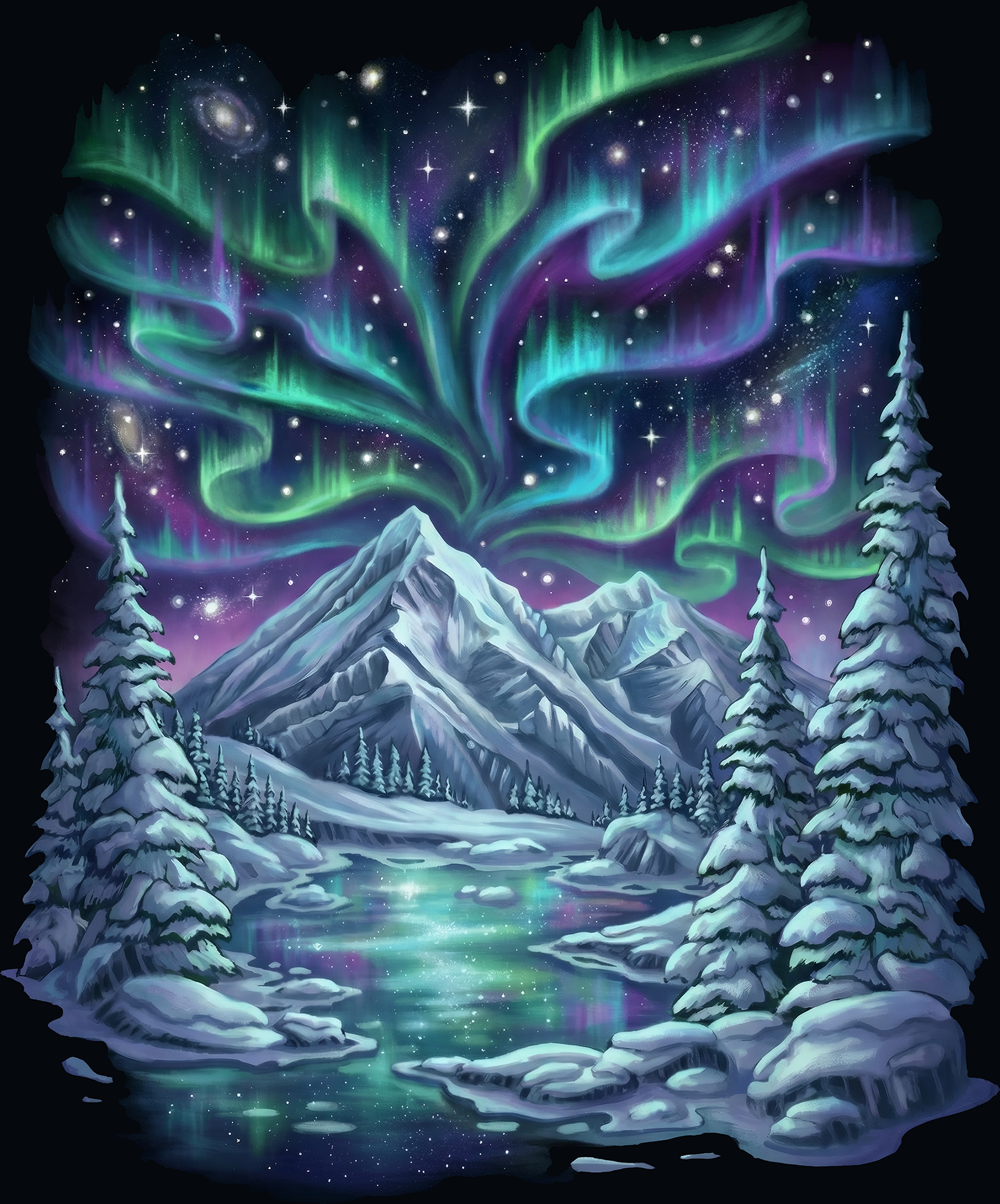 A star-dusted night with aurora dancing above snowy peaks, pines and ice—bright, crisp, and dreamlike. The kind of scene that makes you stop and stare in awe.