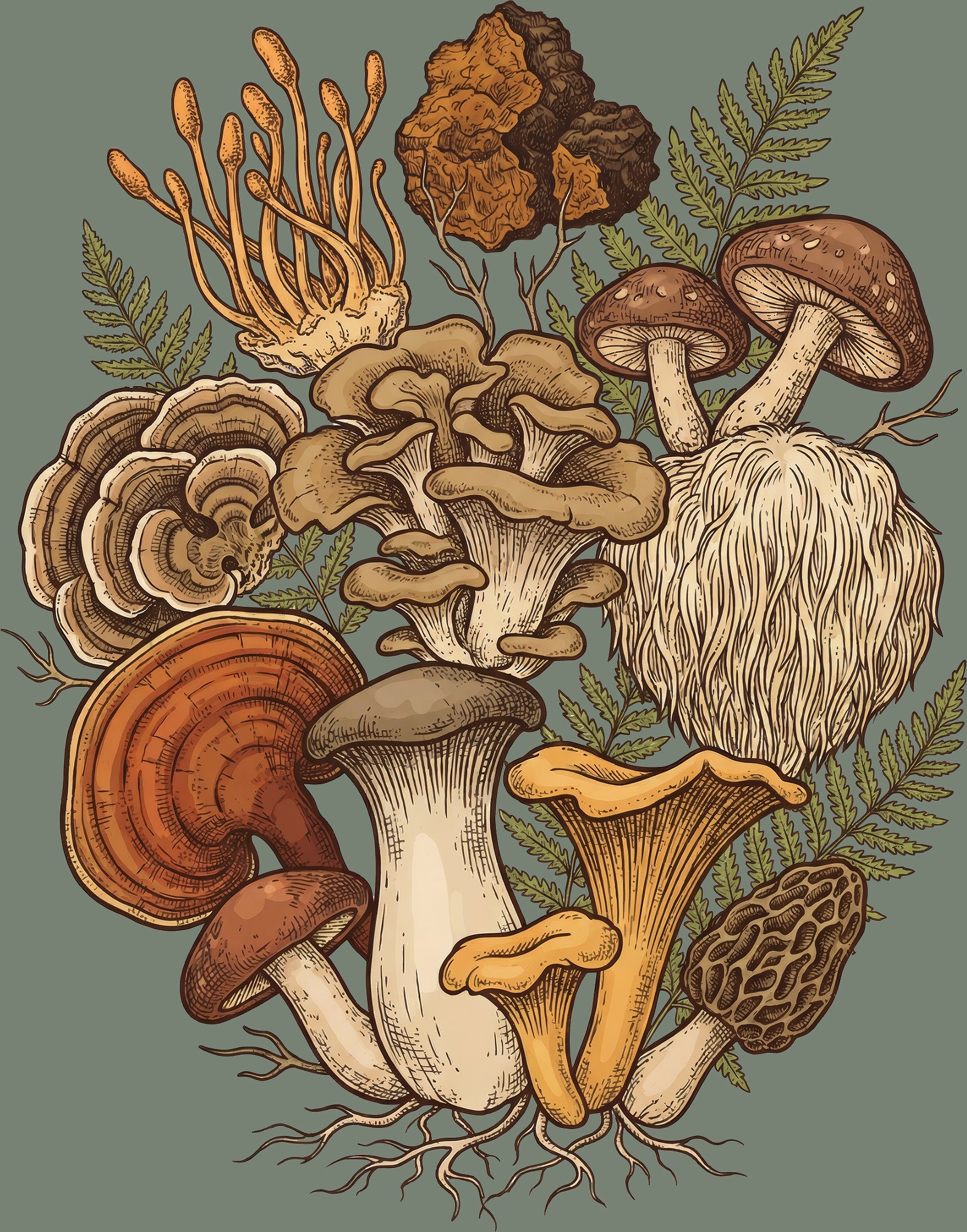 A fungi lover’s lineup, all in one gathering—cordyceps reaching up like little antlers, rugged chaga, layered turkey tail, glossy red reishi, shaggy lion’s mane, ruffled maitake, stout king trumpet, golden chanterelles, spring-time morels, and classic shiitake. It’s the kind of shirt that feels like a walk in the woods with your eyes wide open—where every cap is a familiar friend.