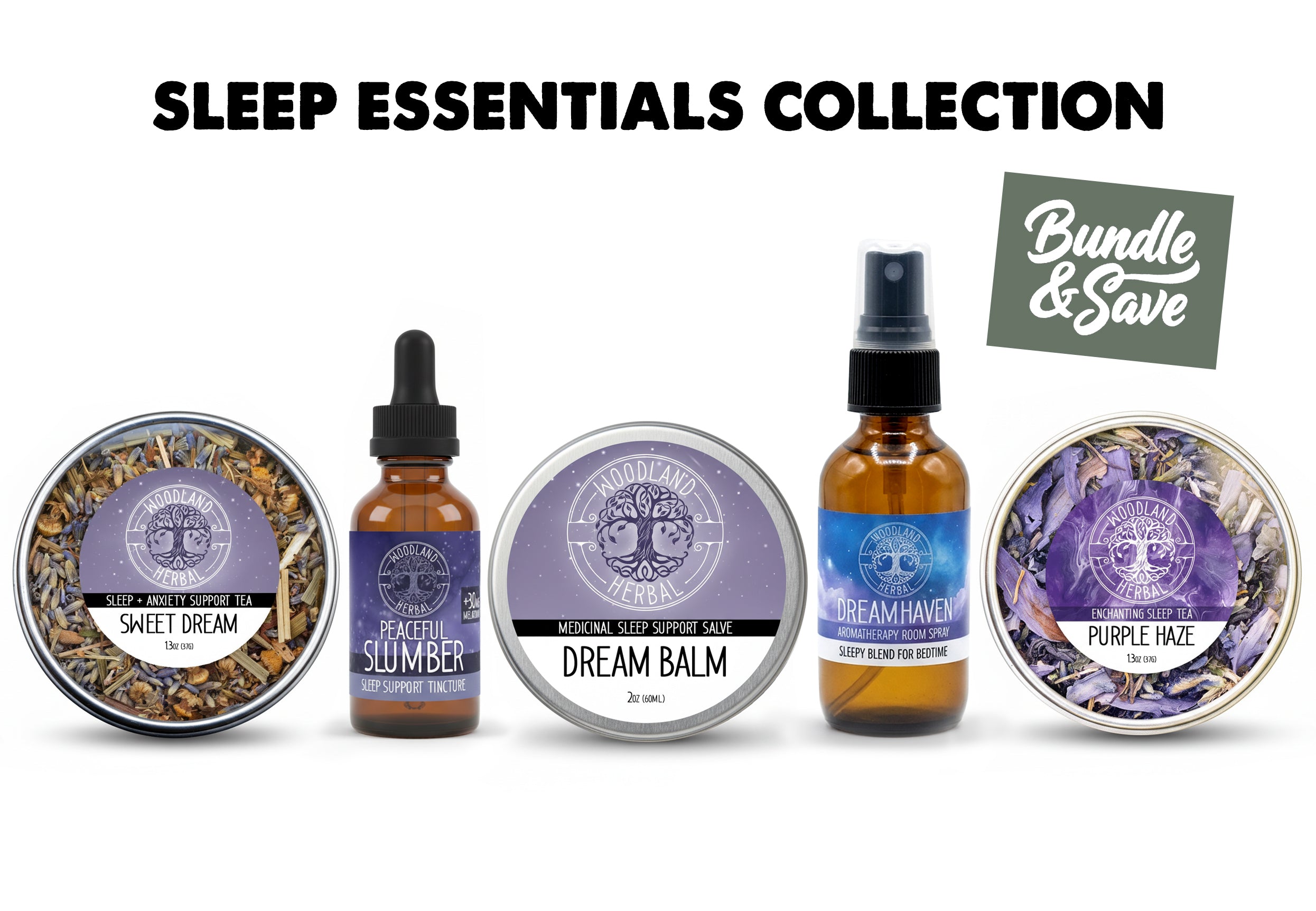 When sleep feels far away, it is rarely just one thing. Sometimes it is a racing mind. Sometimes it is nervous tension in the body. Sometimes the room itself feels too awake. And sometimes the body needs a gentler nudge on one night and deeper support on another. Sleep Essentials Collection brings together five Woodland Herbal favorites for a more complete evening routine, with calming tea, potent internal support, soothing topicals, and aromatic bedtime atmosphere all working from different directions to help ease the path toward rest.